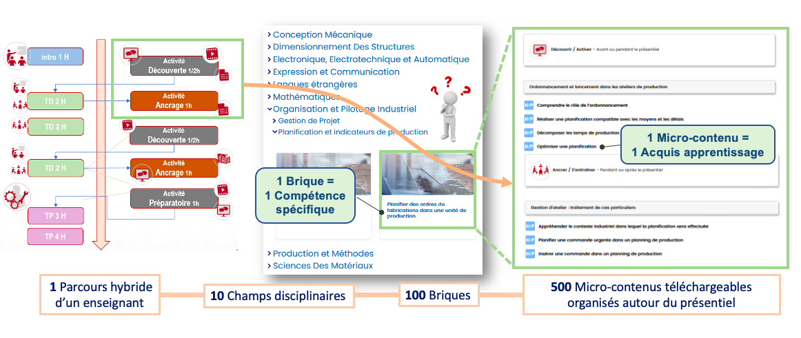 - par micro-contenus (visant un acquis d’apprentissage ciblé) organisés autour du présentiel